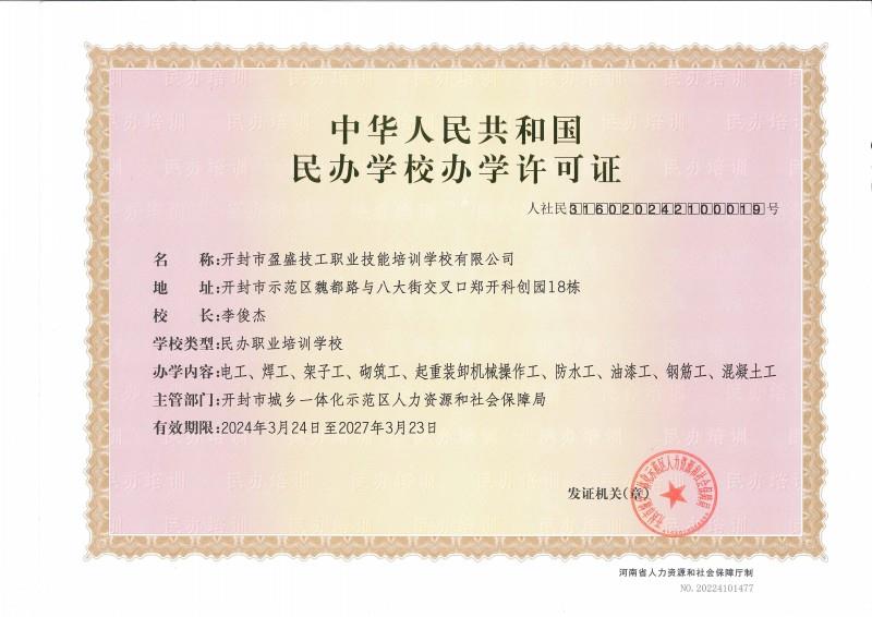 开封盈盛技工职业技能培训学校有限公司创办于2021年4月,是一家专注于资格证认证、建筑职业技能培训的综合性职业培训学校。 学校积极响应"人人持证,技能河南”的政府号召,以“增强学员技能,拓展就业空间”为宗旨,以服务社会为目标,为每一位期望提升自身专业文化和职业技能的学员提供良好的学习平台和稳健的就业支持。 学校秉承“学员至上”的理念,凭借优秀的教师团队,完善的教学设施,准确的考证定位,规范的教学管理,广泛的社会合作,高效的后勤保证,竭诚为社会输送更多的优秀技能人才。