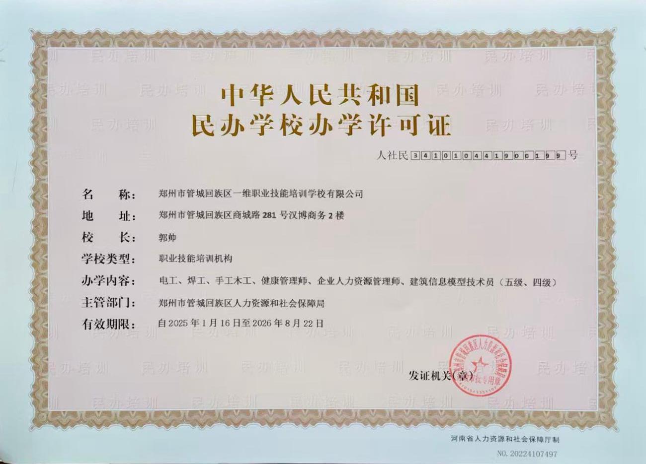 郑州市管城回族区一维职业技能培训学校,是经郑州市管城回族区人力资源和社会保障局批准设立的职业技能培训学校,从事建设行业的相关培训工作。 学校现开设培训项目: 一、建设行业施工现场管理人员(八大员)岗位培训; 二、建设行业技术工人职业技能培训,三、建设行业职业技能提升培训等。 学校地址:河南省郑州市管城回族区商城路281号汉博大厦2楼 联系人:郭老师 13383868191