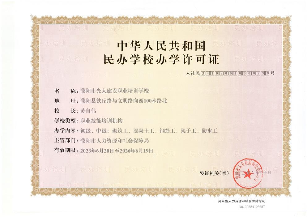 多年来按照省厅培训要求,积极响应省厅培训政策,对我市建筑行业相关人员进行现场培训,是具有濮阳市建设行业培训八大员、技能工种培训资质的培训机构。