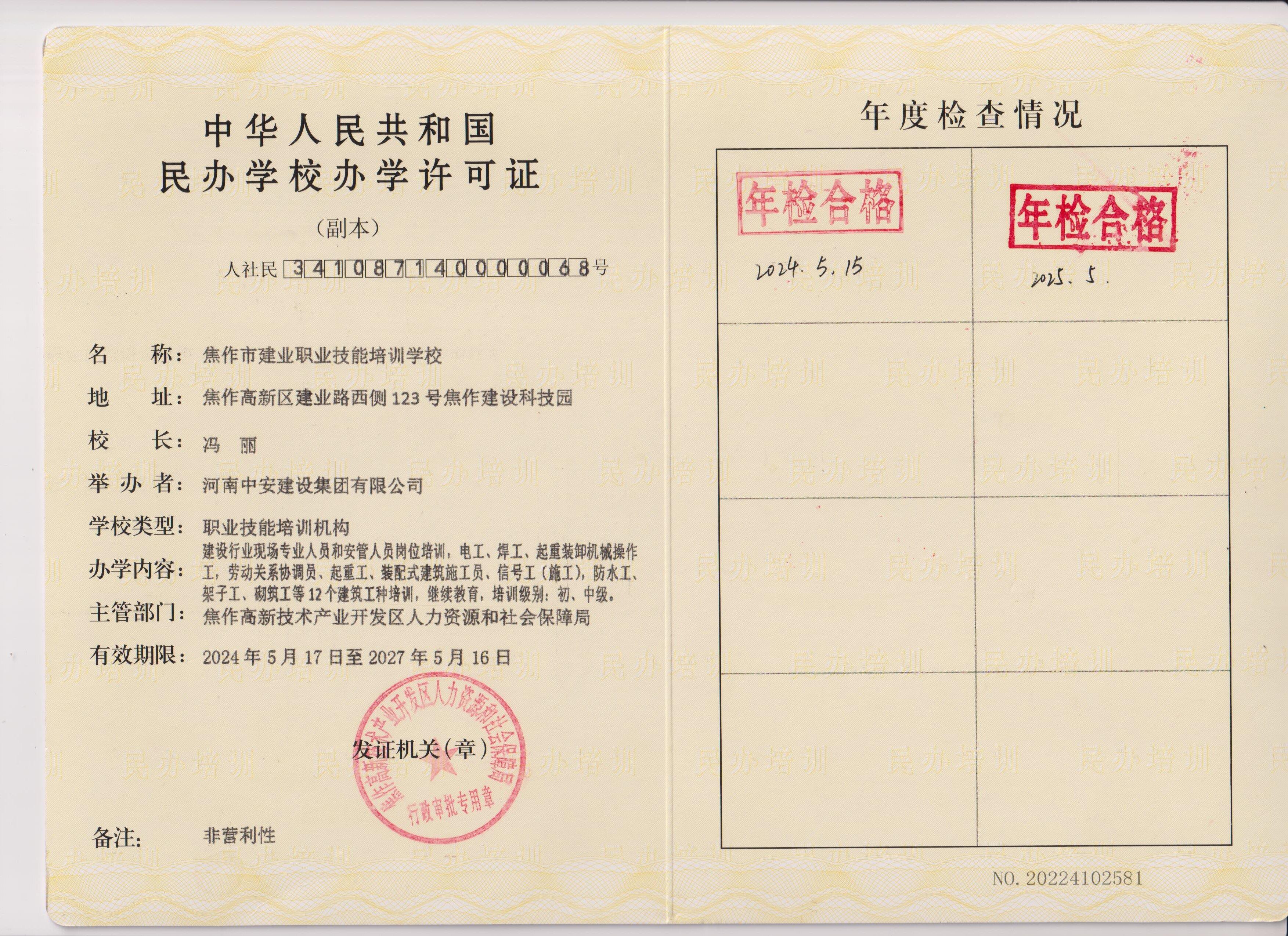 河南中安建设工程有限公司培训中心隶属于始创于1949年的河南中安建设集团有限公司,2002年经原河南省建设厅批准为建设类培训机构,2005年在学校基础上成立了焦作市建业职业技能培训学校,一个机构两个牌子。老校区位于焦作市和平街392号,新校区位于焦作市城乡一体化示范区建业路西侧123号焦作建设科技园。在河南省住建厅人教处、安监总站、建设教育协会、焦作市住建局、焦作市人力资源和社会保障局等部门的大力支持下,十余年来,先后为社会培养、输送了大批建设行业从业人员,赢得了学员成才、企业满意、社会认可的声誉,连年被省、市上级部门评为培训先进单位、诚信示范单位等荣誉。 可以承担以下培训项目。一是技术工人培训(职业技能岗位),主要有:初级、中级、高级 工种分别为:建筑瓦工、砌筑工、瓦工、窑炉修筑工、钢筋工、混凝土工、混凝土浇筑工、混凝土搅拌工、混凝土模具工、混凝土模板工、模板工、通风工、安装钳工、电气设备安装调试工、管道工、抹灰工、镶贴工、油漆工、防水工、精细木工、木工、手工木工、测量放线工、测量工、古建传统木工(木雕工、匾额工),古建传统瓦工(砧刻工、砌花街工、泥塑工),古建传统石工(石雕工、砧细工),古建传统彩画工(彩绘工),古建传统油工(推光漆工),石工(石作业工)等; 二是技术工人培训(特种作业人员):工种分别为:建筑电工、建筑电焊工、架子工、塔式起重机司机、施工升降机司机、物料提升机司机、信号指挥工、司索工、物料提升机安拆工、吊篮安拆工、塔式起重机安拆工、施工升降机安拆工;三是建设领域现场专业人员新培训和继续教育工作,岗位分别有:施工员、质量员、安全员、材料员、资料员、劳务员、测量员、实验员、标准员、机械员、见证取送样员等。 四是建筑业企业主要负责人、项目负责人、专职安全员(安全管理人员)新培训和继续教育;四是建设行业专业技术人员初、中、高级职称职称的继续教育;五是成人学历(大专、本科)教育。