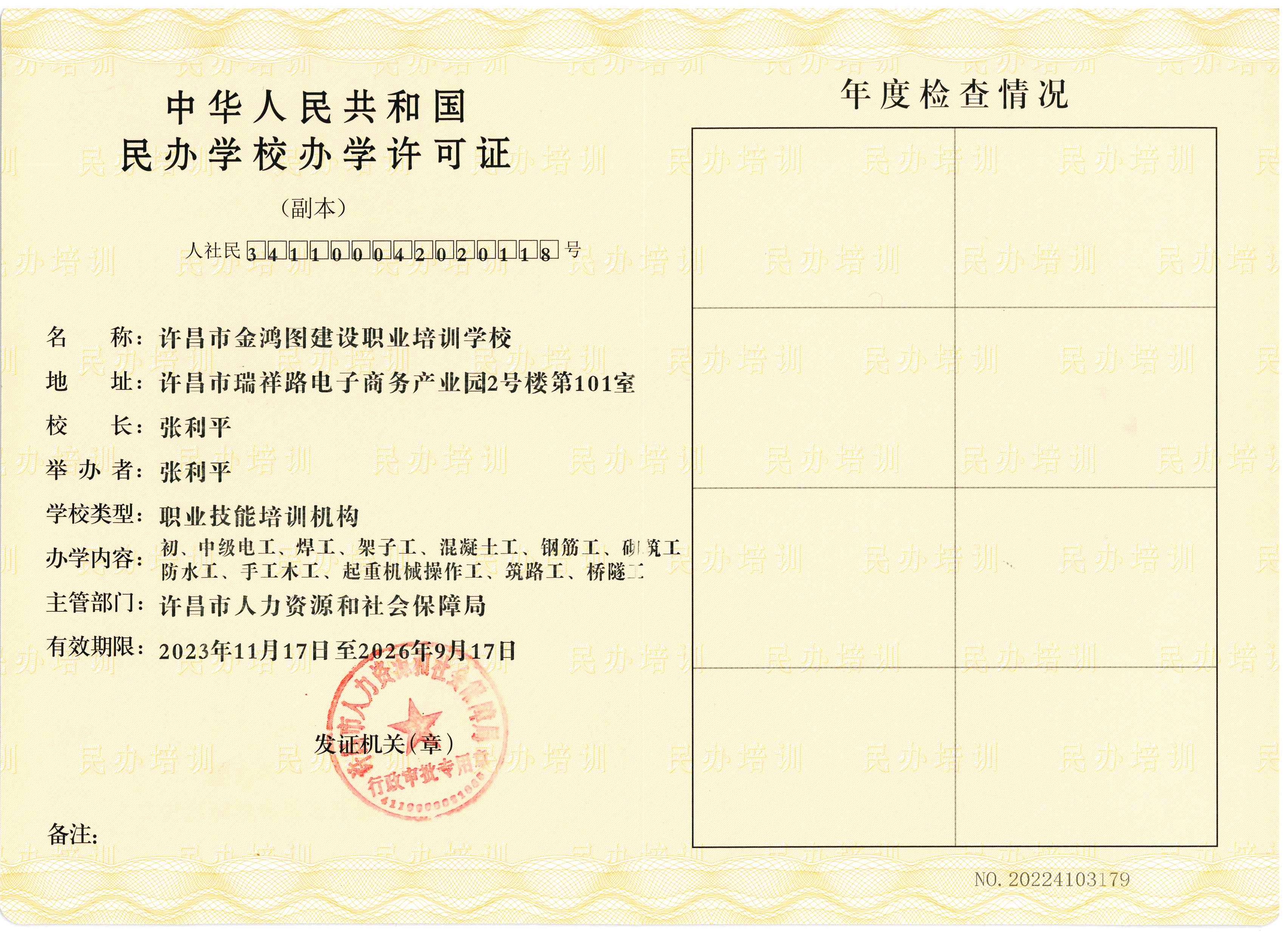 许昌市金鸿图建设职业培训学校是经许昌市人力资源和社会保障局批准、许昌市住房和城乡建设局、许昌市应急管理局备案的一所建设职业培训学校。我校培训、办公面积千余平方米,拥有专业的培训师资团队、专业的培训机房和环境优美的培训教室。专业开展建筑施工企业证件培训,目前我校开展的业务如下: 1、河南省住房和城乡建设厅安管人员(三类人员)新办证培训、技术工人新办证培训; 2、应急管理局的高、低压电工、焊工、架子工等培训; 咨询服务热线:0374-7076677 学校地址:许昌市瑞祥路电子商务产业园2号楼