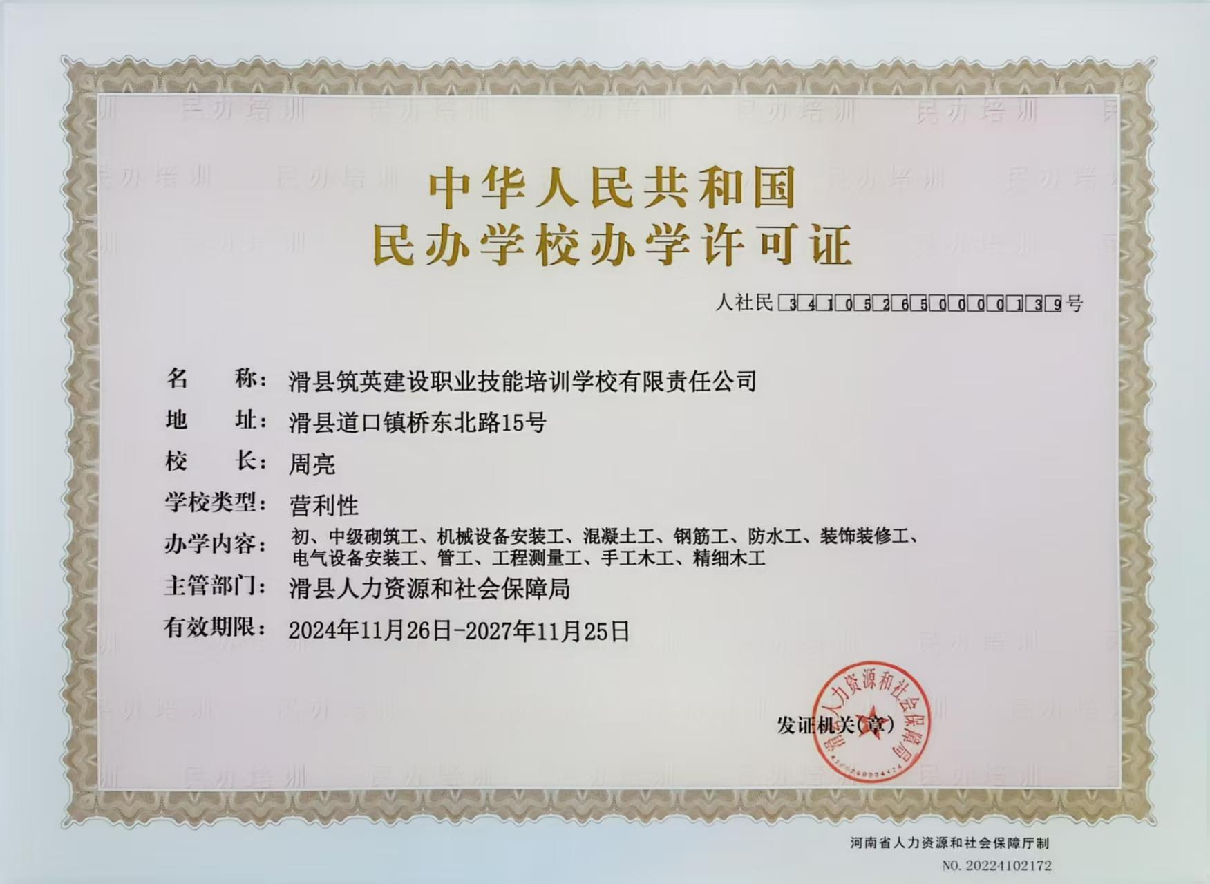 滑县筑英建设职业技能培训学校前身为滑县建设技术培训中心,成立于二00一年六月,是我县唯一一家由省住建厅批准成立具有资质的建筑业技术培训机构。旨在提高我县建筑业从业人员整体素质,为我县建筑业做出贡献。 主要开设有建筑瓦工、木工、钢筋工、木工等24项工种的专业培训。