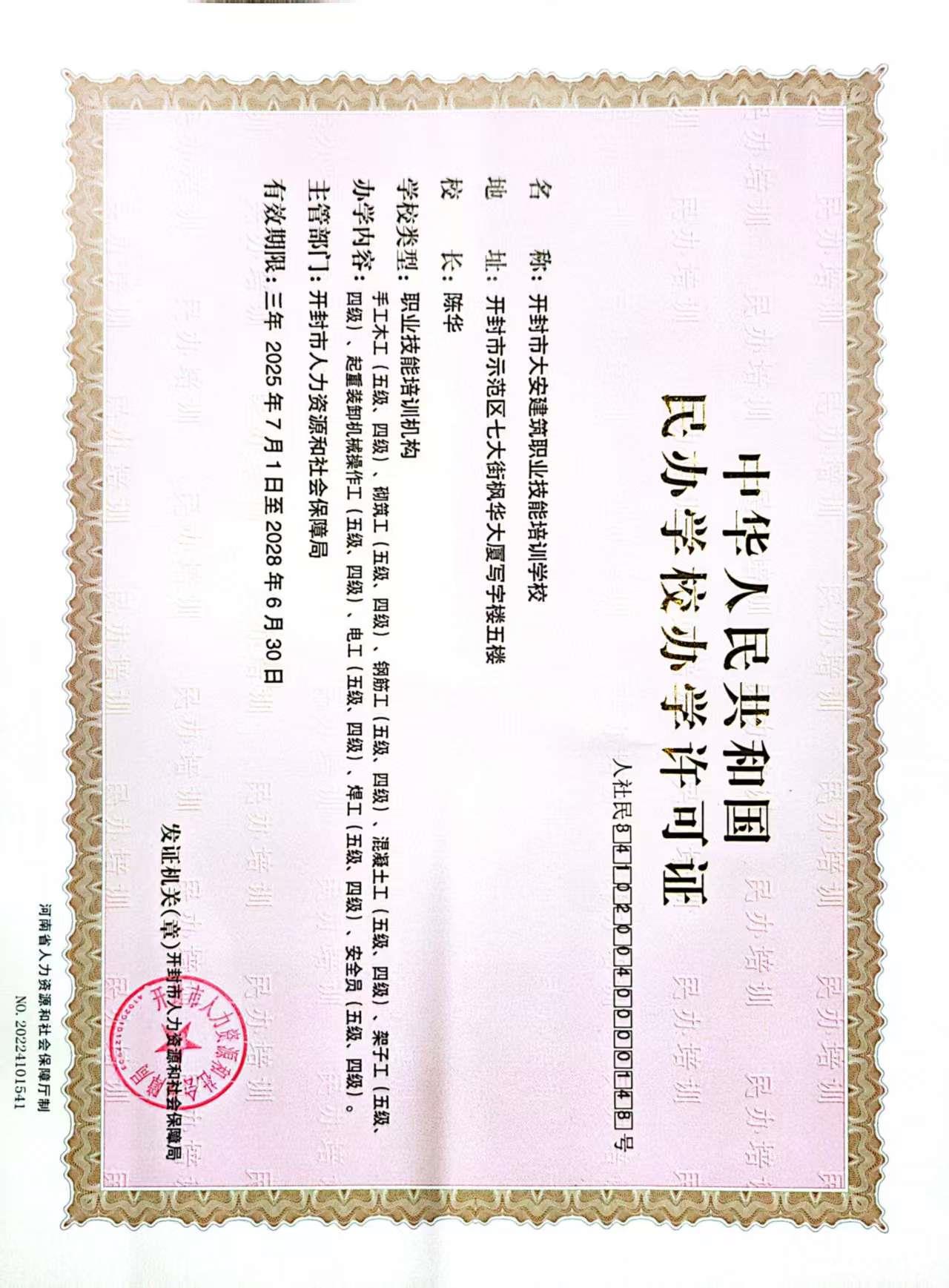 开封市大安建筑职业技能培训学校长期开展住建行业技能工人、建筑施工企业安管人员、施工现场专业人员、建筑施工特种作业人员等相关培训业务